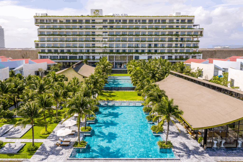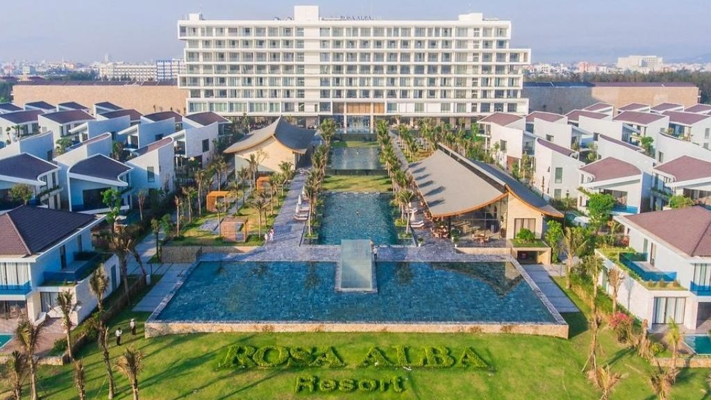 Nằm trải dài bên bờ cát trắng mịn của thành phố biển Tuy Hòa, Rosa Alba Resort & Villas hiện lên như một bức tranh sống động, nơi con người có thể tìm thấy sự bình yên và tinh tế giữa lòng thiên nhiên hoang sơ của Phú Yên. Từ xa, resort như một tổ hợp hài hòa giữa kiến trúc hiện đại và nét duyên dáng Á Đông, với những căn biệt thự trắng muốt xen lẫn trong vườn cây xanh mát và những con đường lát đá dẫn thẳng ra biển.